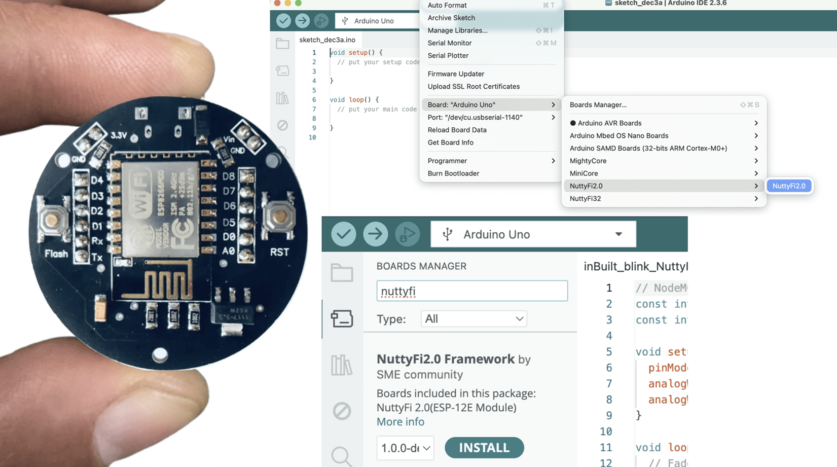 And That’s it. Your NuttyFi board is ready to code. Click Verify then Upload. The onboard LED should blink.